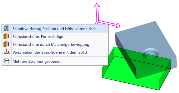 Nach einem Rechtsklick auf die obere Ebene erscheint ein Kontextmenü. Auswahl von Schneiden mit extrudiertem Solid.