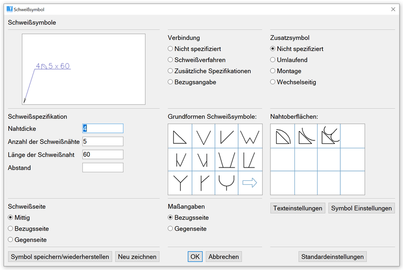 Über das Menü "Werkzeuge / Einstellung Schweißsymbole" können Sie auswählen, ob die Schweißsymbole entsprechend DIN oder ANSI erzeugt werden sollen.