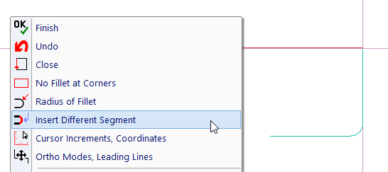 Drawing polyline, you can insert linear segments. Optionally (and by default), each corner is rounded. Also, you can insert a different type of segment. Icons containing polyline options are added into 2D input toolbar, or into pop-up (called by right + left click).