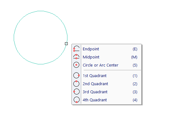 Most 2D objects require geometric input in the form of X, Y coordinates. VariCAD makes it easy to select certain significant locations relative to existing objects. To select a point on an object, move the cursor over the object so that it is highlighted. Clicking on the object will select the point closest to the cursor. If cursor approaches a snap point, such as an endpoint or midpoint, a symbol appears next to the cursor. Clicking when you see this symbol selects the point. The following letters indicate snap points: