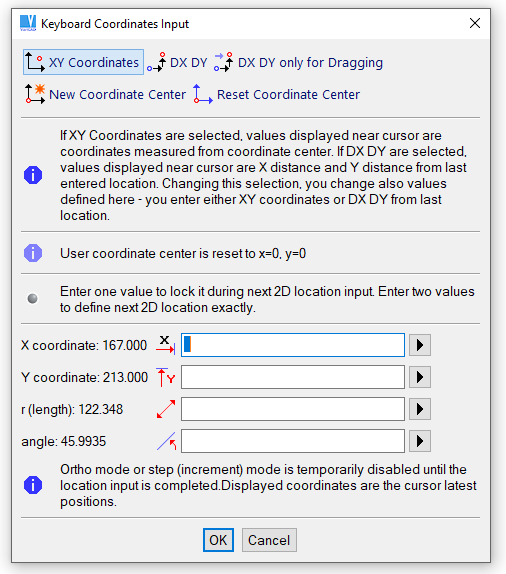 This method of 2D input allows you to use many convenient combinations. It is always available by pressing TAB. Then, a dialogue panel is open. If you continue pressing TAB, you change focus of input of X, Y, radius or angle value.