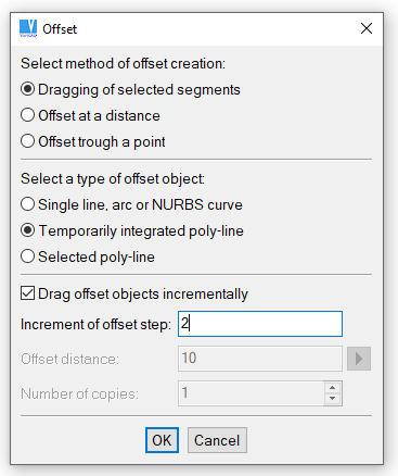 Offset copies can be created for single objects, temporarily integrated poly-lines or existing poly-lines.