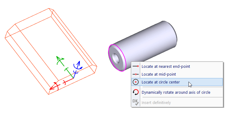 When locating a solid in 3D space, it is placed by its insertion point. The insertion point of each solid is defined during the solid creation. When solids are joined together, the default insertion point becomes the point of the object to which the other object is added (the root solid). When inserting multiple objects, the insertion point of the first selected object is used. You can redefine the insertion point location at any time.