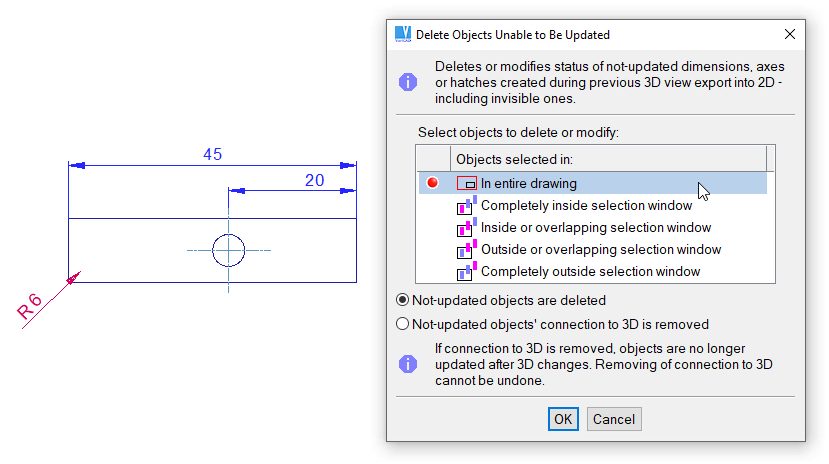 | Remove 3D connections of selected objects. This option appears, if you select 2D objects and some of them cannot be updated. Click the option “For improperly updated, remove connections to 3D” to turn 3D connections off |