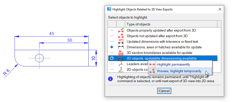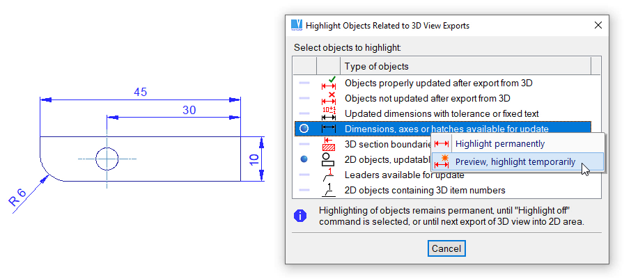 VariCAD provides tools for checking of updatable objects and checking of properly or improperly updated dimensions, axes or hatches. These objects can be temporarily or permanently highlighted.