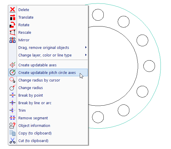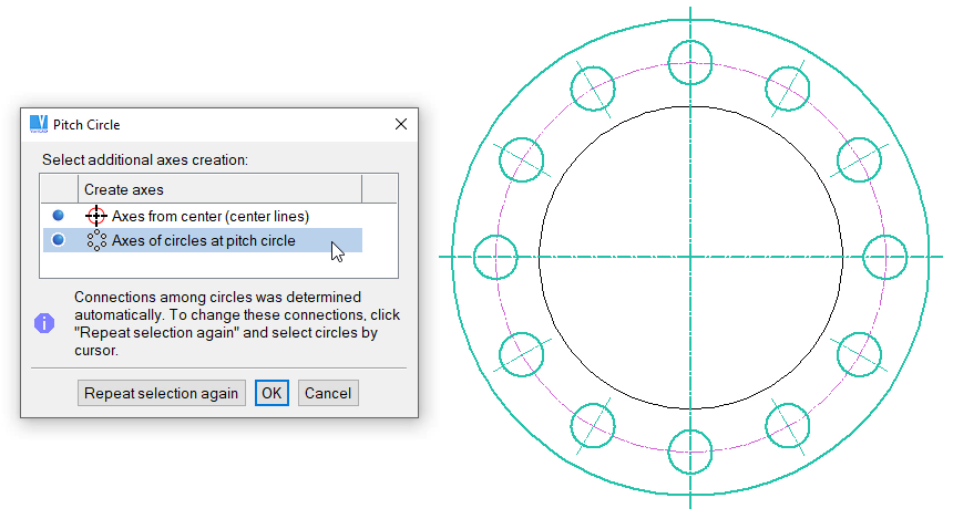 Select an outer circle or inner hole, then select a circle located at pitch circle. Create pitch circle and additional axes. Or, you can right-click outer circle, inner hole or a circle located at pitch circle. Select creation of pitch circle from pop-up menu.