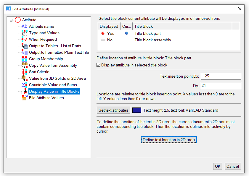 For an attribute, you can select the title block the attribute is displayed in. One attribute may be displayed in more title blocks. Then define: