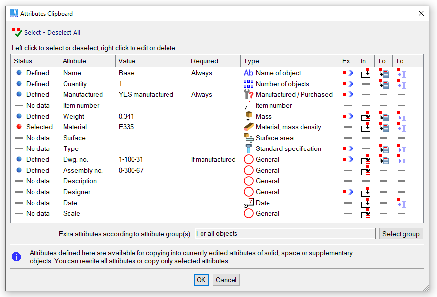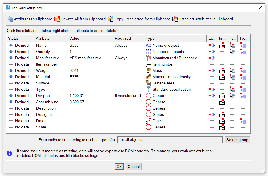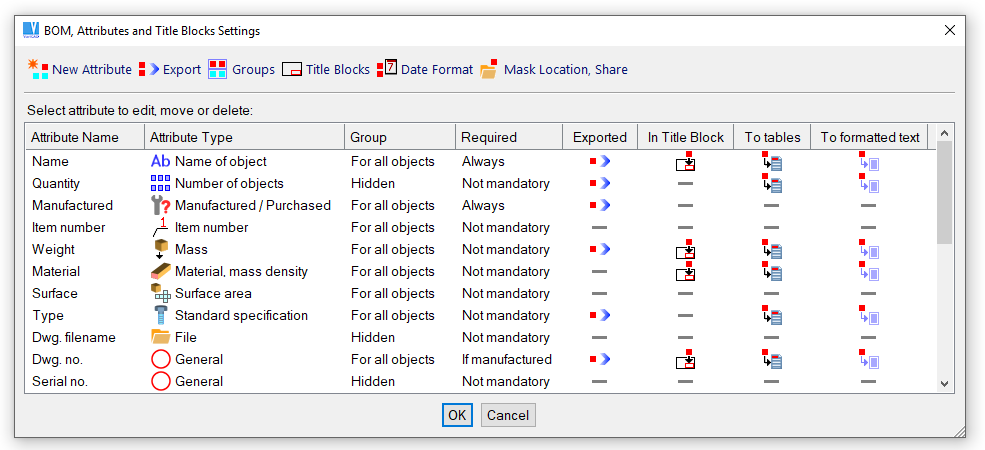 This function allows you to define new attributes, edit or delete existing attributes, manage attribute groups, title blocks and create files suitable for other systems. Attributes and their properties are described below. All settings are stored in file called BOM mask.