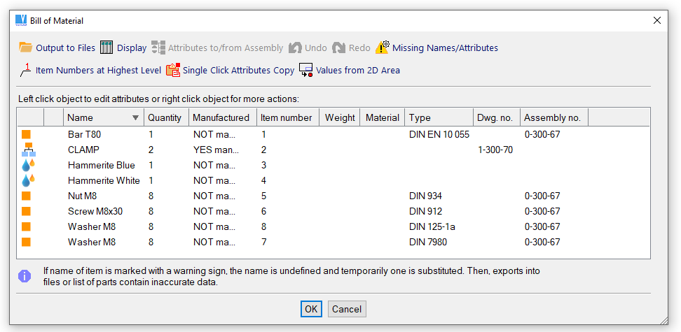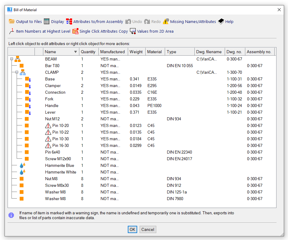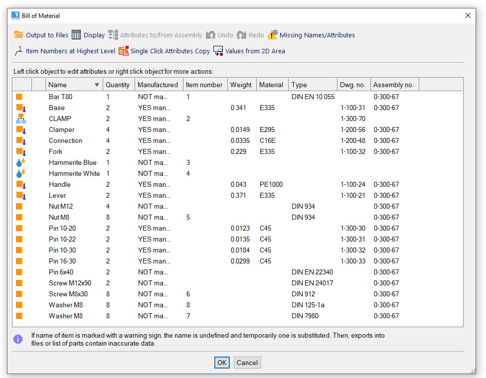 Each solid or assembly can have a defined name and attributes. Mechanical parts such as screws, bearings, and rolled profiles have predefined attributes and names. Attributes and names can be used as a method of selecting solids (selecting solids according to their attributes). Attributes can be inserted into title blocks in 2D area, can be listed in files containing the list of assembly parts and can be exported into files suitable for other systems, like spreadsheets. The object name is, in fact, a sort of attribute.