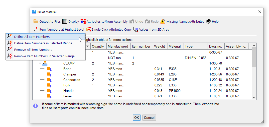To define item numbers in BOM, your BOM mask must contain attribute of type “Item Number”. Then, you can assign item numbers to objects in assembly, at the highest level. After creation of 2D, item numbers are automatically used as leader texts.