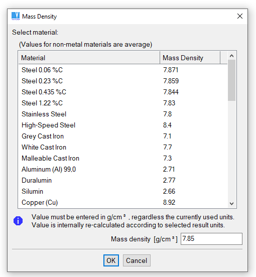 Mass density is stored for each solid together with material. If a mass of an assembly is calculated and different materials of different parts are used, the calculation copes this correctly. If some or all solids have no material defined, mass calculation asks for mass density. Then, entered value is used only temporarily for the calculation.
