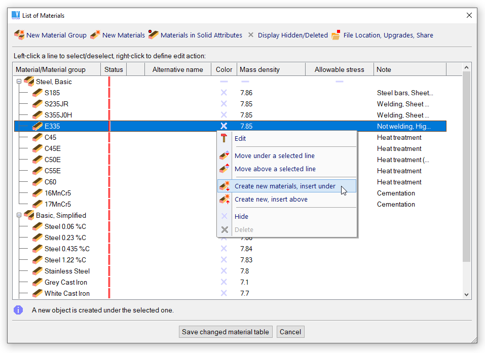 To create a new material, right-click a line and select, whether the new material is inserted above or under it. You can also click a corresponding icon at upper row of icons. To create a group of materials, or to edit or delete material or group, click a line and select a step from pop-up menu.