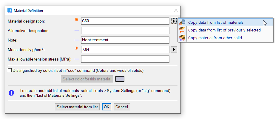 | Material – value contains material of the corresponding part. If defined, you may select from previously used values or you may copy the material from another solid. |
