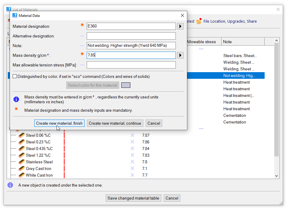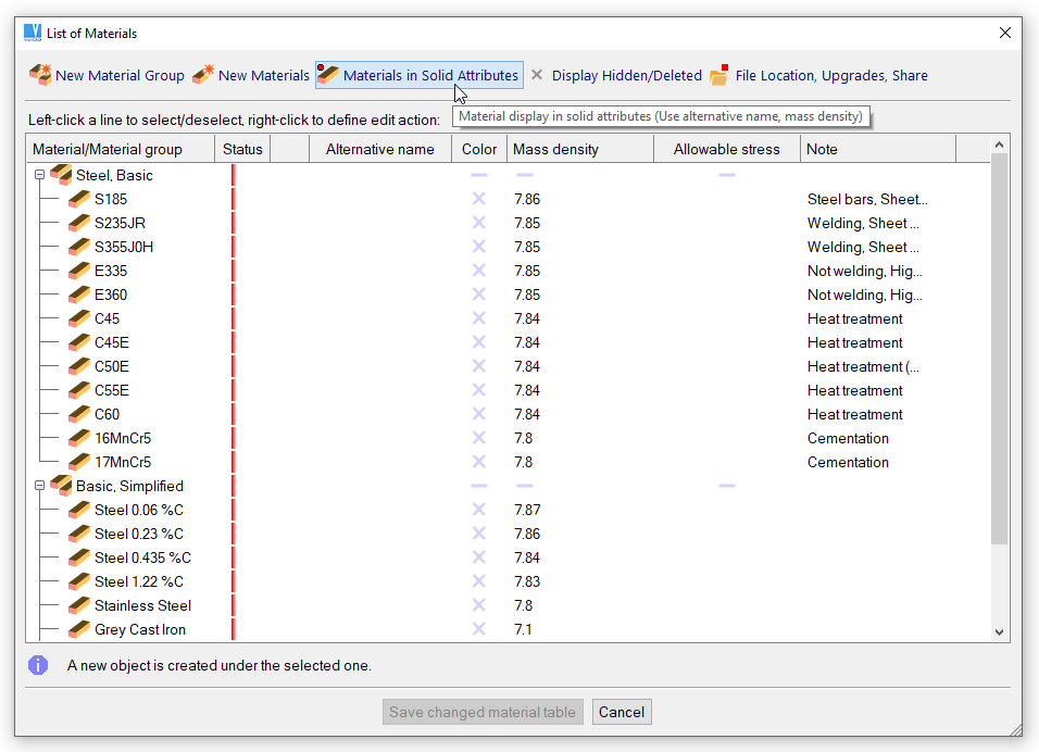 For definition of solid attributes and BOM data, material of solids can be selected from a list of materials. The list of materials is distributed as a part of VariCAD package. However, the distributed list is rather schematic and short. Each user can add materials used in his company, or edit existing data. Materials in list are sorted into material groups.