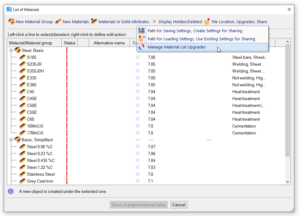 Sharing of list of materials is available from the same menu as you can select update options (see above). If you create a material table suitable for all other users, then save it into selected network path. All users need to set the same network path for loading of list of materials.