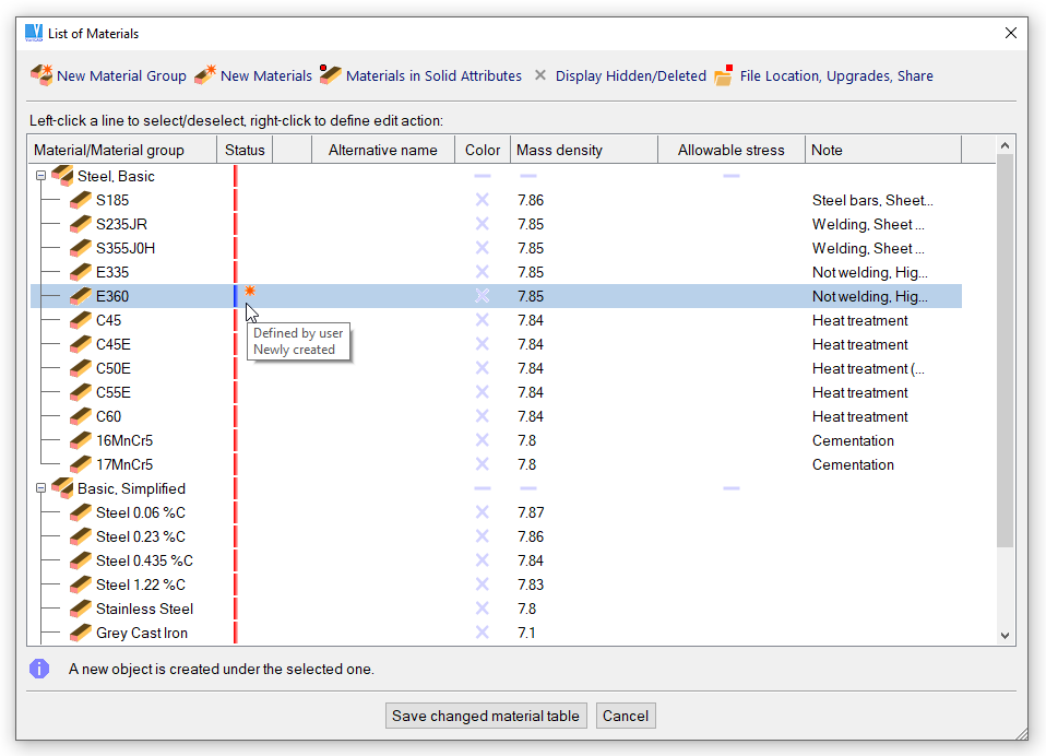 Data (materials or groups of materials) in table may be original or user-created. Original data are updated from VariCAD distribution. They cannot be deleted or renamed. They can be hidden, or partially edited.