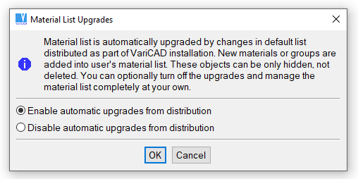 This command manages list of materials. You can run it also from system settings – command “CFG”, from General section, “List of Materials Settings”. Here, you can delete user-defined list of materials. If the user-defined list is deleted, a new one is created as a copy of list distributed in VariCAD package.