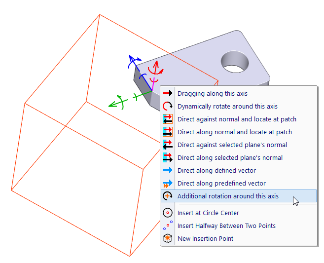 Another advantage of additional rotation around axes combined with constraint definitions is a possibility to constrain objects in any direction, regardless of the initial state of their axes. Objects are always constrained in direction of X, Y or Z axis. The axes are directed according to how a solid was created, and the direction may not be always convenient. After transformation of objects and additional rotation around an axis, you may constraint objects exactly in desired direction.