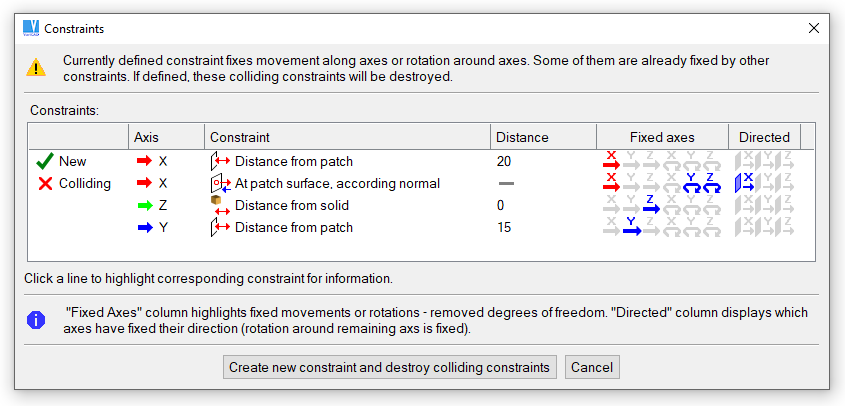 Definition of a constraint rewrites all existing constraints whose fix any axis of the object the same way as the new constraint. Fixed movements, fixed rotations or defined directions for the constrained object are displayed in the upper part of the Constraint panel.