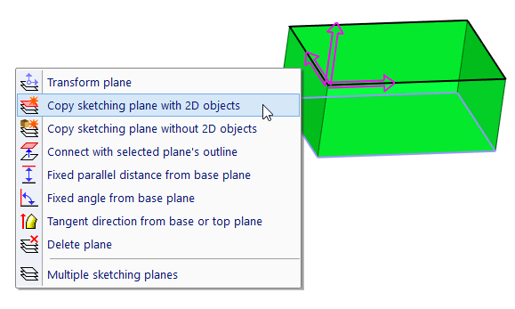 | Copy a sketching plane together with all 2D objects. A new sketching plane is transformed and located the same way as a new or transformed solid. |