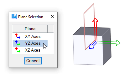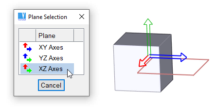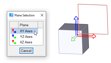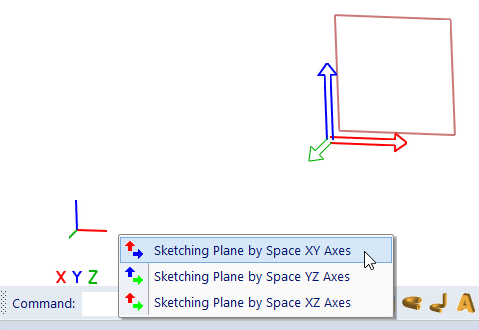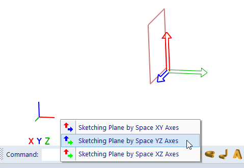 Selection of axes. This pop-up menu is displayed if 3D space is empty. Sketching plane corresponding to menu item is highlighted. Plane axes are displayed as axes of sketching plane, not as world axes.