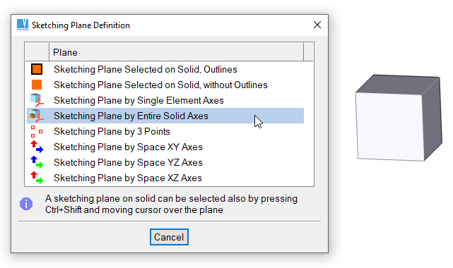 This dialog panel is displayed, if 3D space contains solids. Sketching plane can be selected also at solid planar surfaces or solid axes.