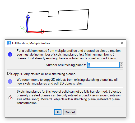 Created or edited solid is displayed as a transparent object. By default, the shape is permanently updated after each change of the profile’s shape. If a solid can be created from all 2D profile objects, it is displayed in green color. If the created or edited profile contains an error (like intersections of lines or gaps between lines’ endpoints), the solid is displayed in red color at the last correct position.