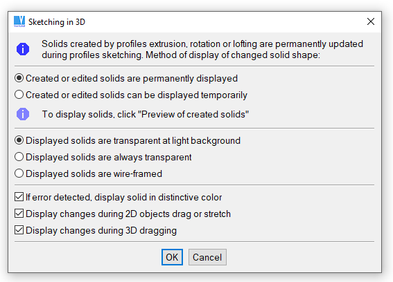 It is possible to manage how the edited solids are displayed. Wire-framed display can be used instead of transparency, or a solid may not be updated permanently.