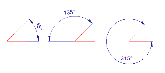 Example of default angular dimensioning, complementary angle dimensioning and dimensioning of angle greater than 180 degrees