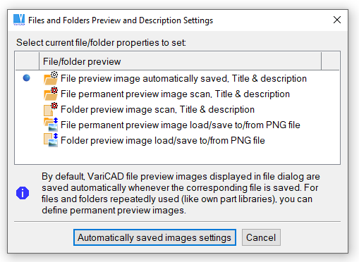 If a permanent file preview image is defined, you can save it into PNG format. Then, you can edit the image outside VariCAD and load it back. Or, you can load PNG image completely created outside VariCAD (for example, a logo). It is necessary to save/load a pair of images. Images dimensions are 400x250 and 800x500. The larger is used for 4k resolution.