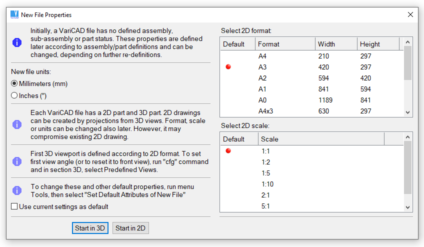 VariCAD file contains both 3D part and 2D part. Settings of a new file attributes are mostly related to 2D part. If you open a new file, you do not define assembly, sub-assembly or part file status. These attributes can be created later, according to assembly or part definitions.