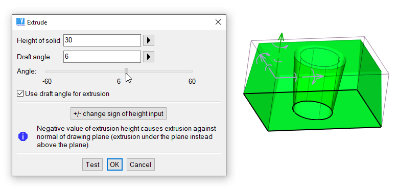 Command extrudes a profile to specified height, forming a solid. Profiles must be closed and multiple profiles are allowed inside the outer profile - this will create holes in the solid. Optionally, you can select a draft angle of extrusion.