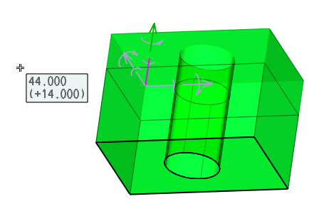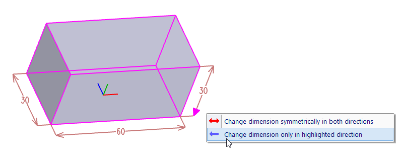 You may click a witness line or an arrow of the dimension. Then, you may drag the dimension by cursor movement. Together with it, the shape of entire solid is changed. Some situations even permit to change the dimension in direction of the selected arrow, or symmetrically.