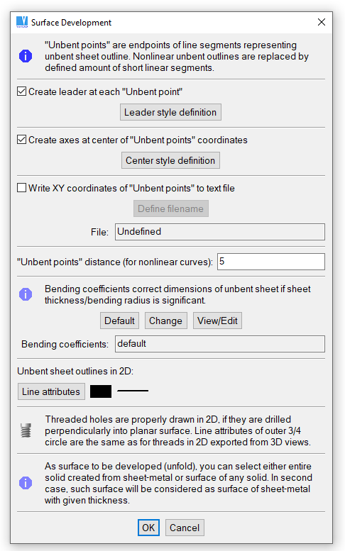 These unbent objects are created in the 2D drawing at a 1:1 scale, and can therefore be used as template, if 2D drawings are plotted. Surface outlines are lines or curves approximated into short line segments. The XY coordinates of outline points can be saved to a text file. Leaders can also be placed at outline points.